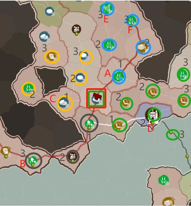 1,修复部队行军速度科技显示有效实际无效的问题 2,修复无法更改要塞部队行军路线的问题 3,修复选才页面新特性图标显示不正确的问题 4,修复剧本中补给包和高级补给包名字重复的问题 5,登用时,当选定登用目标后,本族族人默认按成功率由高向低排序 新的尝试:粮道 我方部队的三格内的道路如果全被敌方部队控制,粮道被断,我方部队陷入断粮状态,直至粮道恢复。 如下图所示,数字123为影响我方部队粮道的道路,