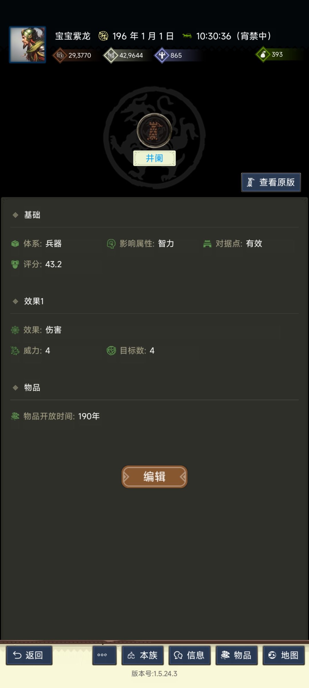 1,听说人出征时没看【占领目标】仍是【所有经过的村镇】,然后就开着到处冲,最后英勇灭在12级城头上。为了避免这种杯具,每次出征时【占领目标】默认为【目标村镇】。 2,主帅方针发动不会影响战法CD 3,剧本编辑开放武将编辑。