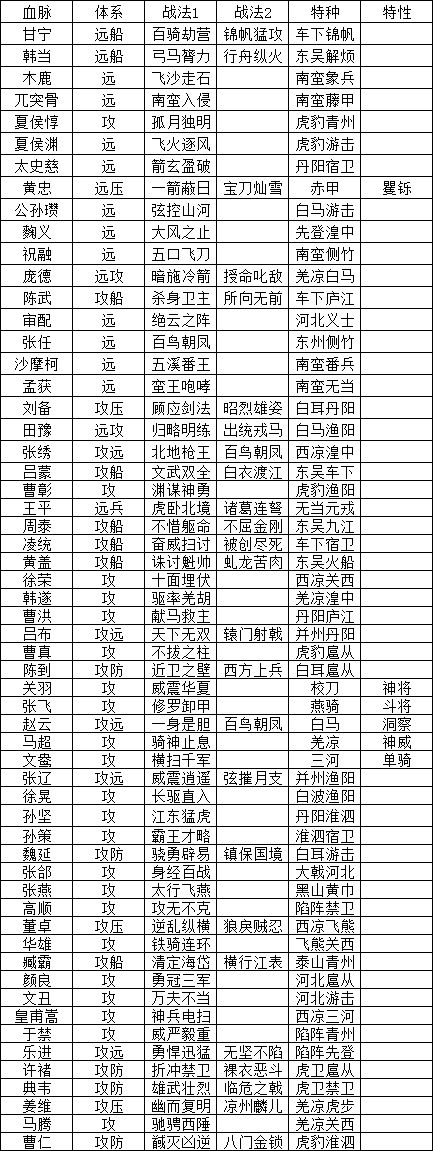 一、战法简述 襄阳区战法体系分为: 主体系:攻击、远程、计略、支援 副体系:压制、防御、兵器、船 一个武将,必有一个主体系战法。 二、武力类特种兵 除五虎吕布文鸯外,所有武力类型武将,都配有两个血脉特种兵。且任意两个武将的特种兵不会完全一致。 三、武力类特性 本测武力类武将只有五虎文鸯吕布继续保留血脉特性,其他武将的特性均转为历史专属。