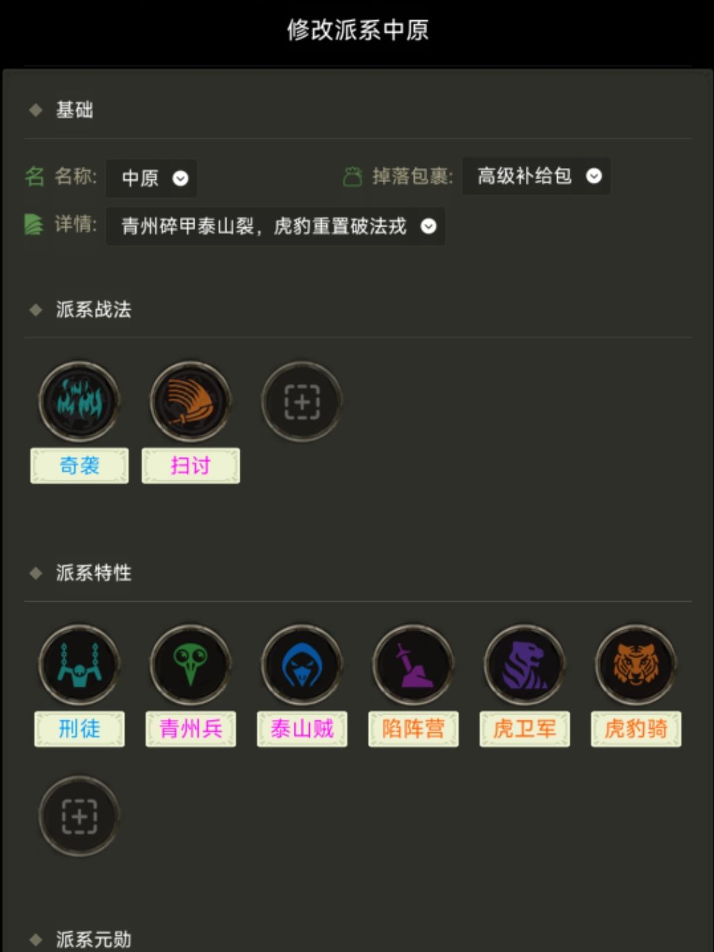 青州碎甲泰山裂,虎豹重置破法戎 核心定位:霸道体系 / 核心能力:重置 【中原】派系立足于【霸道】体系,其核心战斗特色在于灭敌后重置战法CD。 * 核心机制解析:当【中原】派系的武将集齐6项特种兵达到完全体状态时,在其他增益效果之外,还能灭1敌后重置6个战法的CD。当敌人兵力不足时,能实现战法释放无限循环的强大战场统治力。 * 派系核心配置: * 派系战法:奇袭 扫讨 * 派系特性(特种兵)