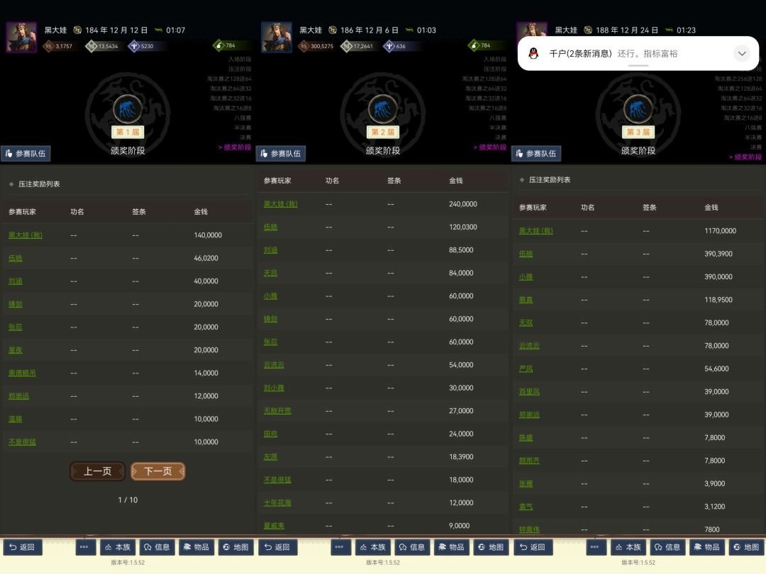 新手攻略,玩了几天,把自己解决的问题给你家分享下。 玩了两个号,一个文将,一个武将。正好两个新区。一区一个。 图1.2.3.是文将。图1,是加入了刘备氏族,他还没有成立势力,我算是原始股东了。刘备就4个人。关泰也是个玩家。他来的比我早。 图3是刘备打仗带着我。相当于完全托管。自己每天都可以接受朝廷建设土地的任务。然后当朝廷的官。氏族建设完全不用管。 图2爵位是子爵。刷的很快。已经可以成立自己家族了。但我觉得没必要。跟着刘备混,完全托管。每天就做做皇帝发布的任务。 加入NPC的士族后就只能建设土地。其他啥也干不了。所以推荐文官加入,因为更新了领土剿匪加民心的任务,纯武官也可以加入了,加入后可以做剿匪任务。纯看武力值。 图4,5,6是武将号,武将号玩的好要做朝廷发展氏族任务。先看一下位置和粮食,还有土地最大占有,一定要有空位。如果有空位在加上钱,粮充足,你就可以加入了。加入后可以控制所有人和事,先点开图5征兵。重点是族兵和壮丁。把壮丁变族兵。族兵就是你的兵。等会打仗要用,所以越多越好。 加入后祖族里所有人全部征兵10日。把他壮丁全部变成族兵。你就可以带着打仗了。因为不是自己家族所以一点也不心疼。随便浪。 这个阶段自杀过好多次。现在能看懂地形,势力还有玩法。就不咋自杀了。下面是自杀原因。大家注意避坑。 因为带兵外出太久导致族里粮被我吃光。,小兵一直跑。搞得我满头大汗,不知所措。紫砂锅, 因为迷路,找不到家,回不去了。满头大汗,不知所措。紫砂锅, 因为没兵,打不了仗。满头大汗,不知所措。紫砂锅, 自杀过7-8次。反正有困难就自杀删号从重新研究。 图9就是和其他玩家互动了。 感觉挺好玩的。 萌新满头大汗,不知所措时就自杀。慢慢玩别。 过两天遇见新问题估计我又要自杀了。 文将基本不尝试新东西了。每天就做做朝廷任务升官发财。最后等世界结束。 武将在考虑要不要成立自己的氏族。发展自己的势力。结婚生子。养神将。