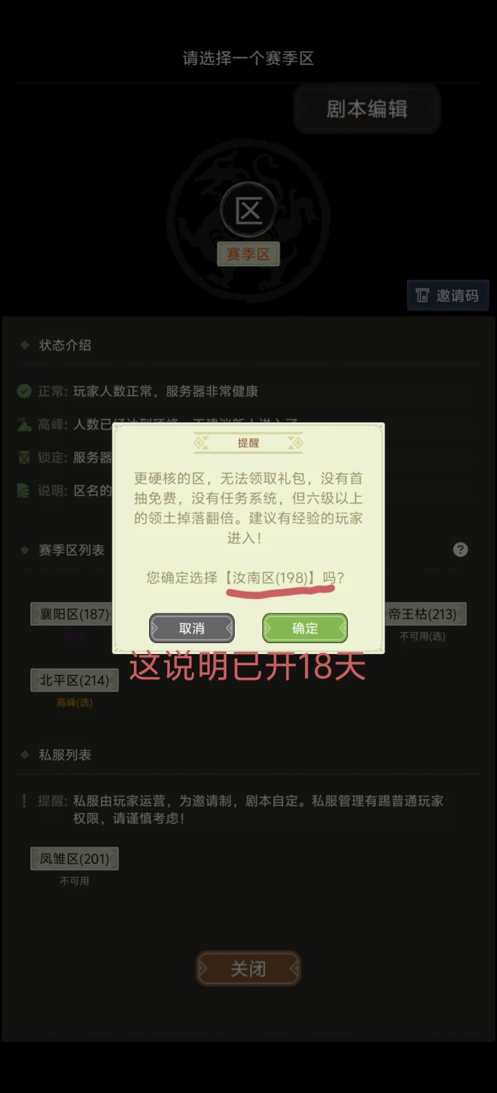 老规矩,例行提醒。赛季重启,只保留成就,所有新老玩家同一起跑线。新赛制,按阶段开发区域,让各势力都有驻足的发展机会,进而在208年竞争帝位。为了更显公平,强制每个设备每个网络每天只能登录1个帐号。本区预计将于 2026-02-18 21:00 重启(以游戏内为准,这里只是例行预告)汝南特点:1,剧本稳定2,无法使用签条礼包3,没有任务,严格控制奖励发放4,6级及以上的村镇掉落翻倍