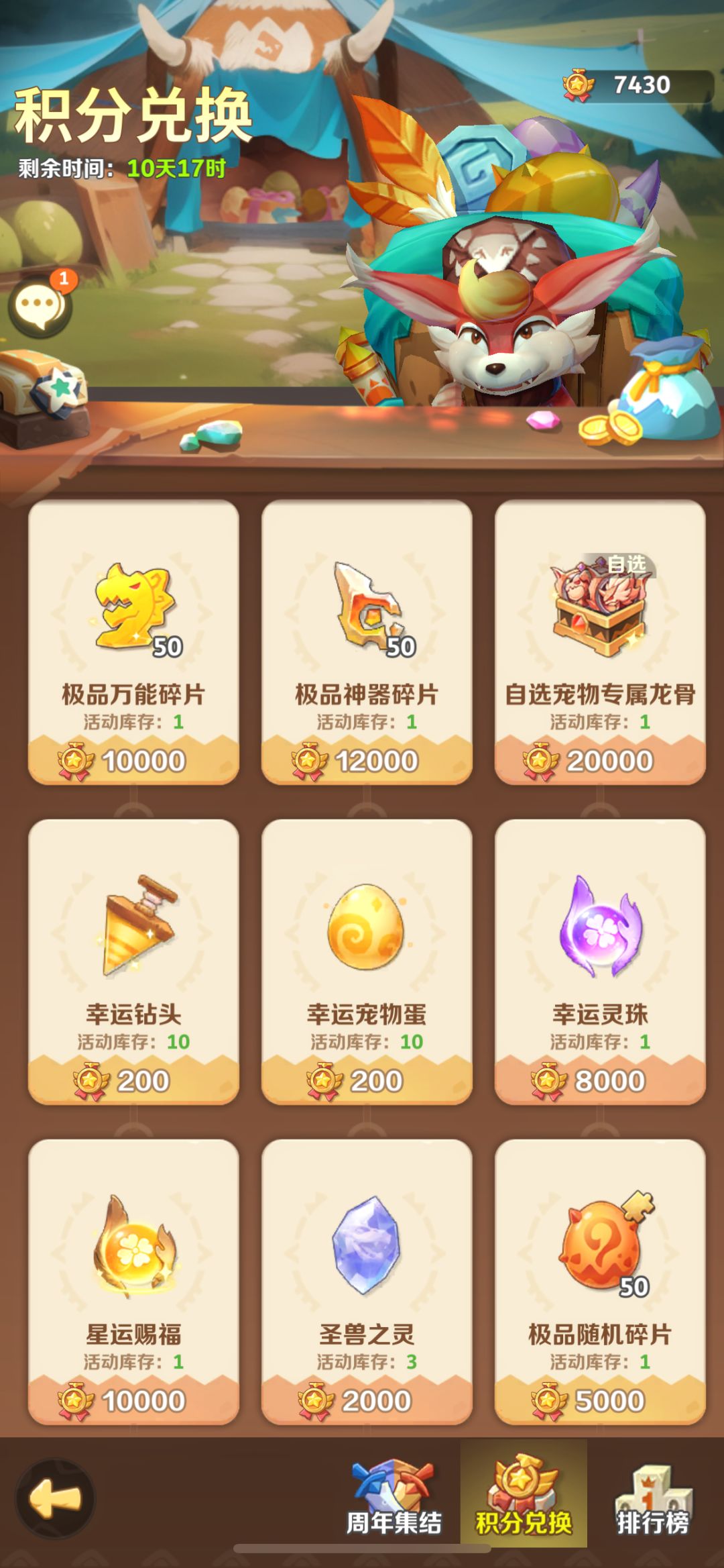 壹路同行 -周年集结积分兑换,换哪些性价比最高? 关于周年集结的积分兑换,性价比最高的优先顺序,为 【自选宠物专属龙骨/20000积分】→【极品神器碎片/12000积分】→【传说万能碎片/20000积分】→【圣兽之灵/2000积分】→【极品随机碎片/5000积分】,若为前中期玩家,比较缺宠物的状况下,可以将【传说万能碎片/20000积分】排第2选择。 很多人会问,新兽灵【极‧自选传说头骨/四肢