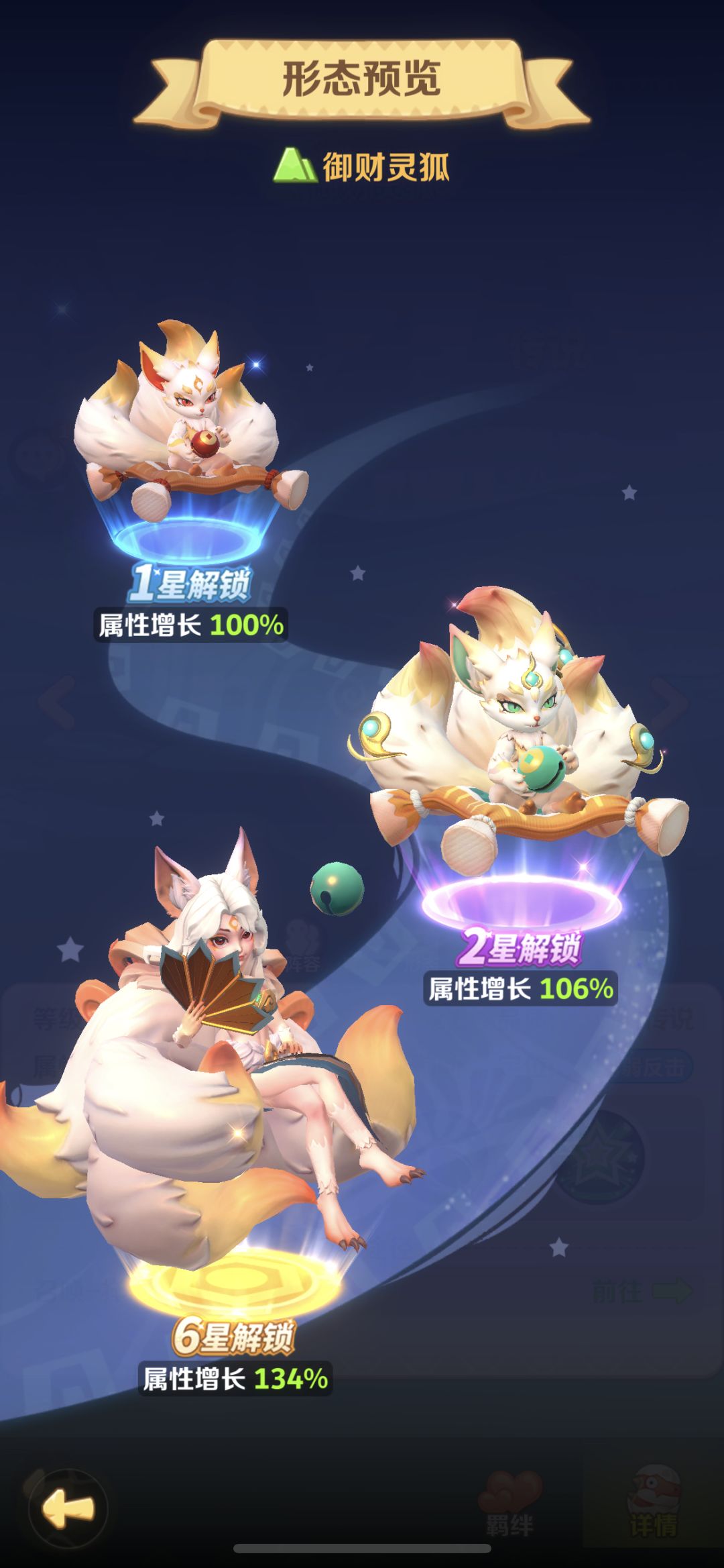 新宠物-御财灵狐(养成建议) 【小名】:灵狐、狐狸、妖狐 【抽蛋难度】:★★★★★ 【宠物强度】:★★★★★ 【定位】:削弱减益、增伤加暴伤、护卫反击。 【下位替代】:无 【兽灵】:电闪雷鸣4件+烈焰巨兽2件。 【龙骨】:生命百分比优先、防御百分比其次。 【5000龙骨优先顺序】︰财宝守卫-富贵同享-财源滚滚-投币。 【附生兽灵】飓风兽角。 【符石特效】:固守+明月清风/尖锐外壳(增加在战场的存活