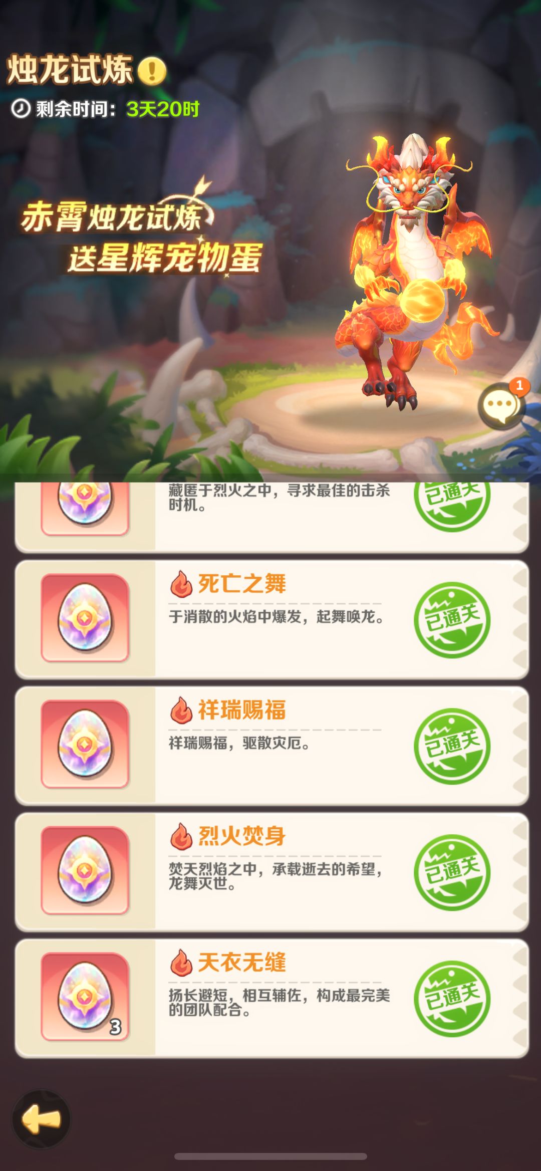 【赤霄烛龙试炼送星辉蛋】闯关阵容解答:开心[表情_开心] 【熊熊烈焰】比心[表情_比心] 火海之中,烛龙降临。 炽火醉龙1号位、赤霄烛龙2号位。 【定点打击】吃瓜[表情_吃瓜] 若能控制火海的燃烧范围,或许会有意外之喜。 炽火醉龙2号位、赤霄烛龙5号位。 【层层烈焰】泪目[表情_泪目] 不断升温的热浪,点燃爆发的征兆。 噗噗火鸡1号位、怒焰狂牛2号位、赤霄烛龙3号位。 【以静制动】尬笑[表情_尬笑]