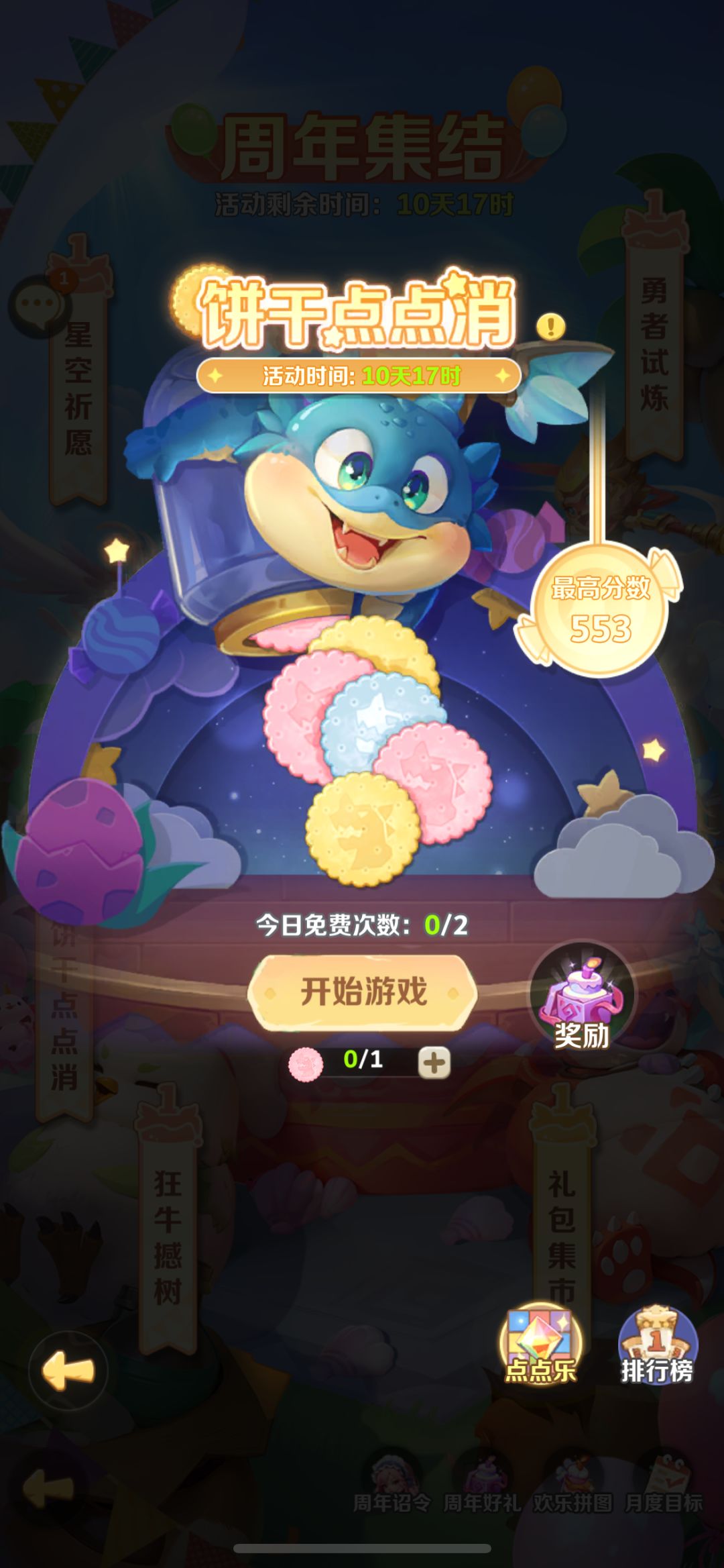 饼干点点消,点点乐应该怎么玩? 每日免费2次游戏次数,可使用指定道具增加游戏次数。另外,非每日免费的次数,将不会获得礼盒奖励,但可以刷新最高成绩! 新推出的小游戏,确实非常好玩,测试酋长的反应跟速度能力,我给各位酋长测试过单手以及双手玩,结果发现还是双手速度会快些,当然也是看各位的习惯,指不准有些人就是喜欢一阳指。 点点乐的排名奖励也是非常诱人,第一、二、三名,分别都有100、90、80个饼