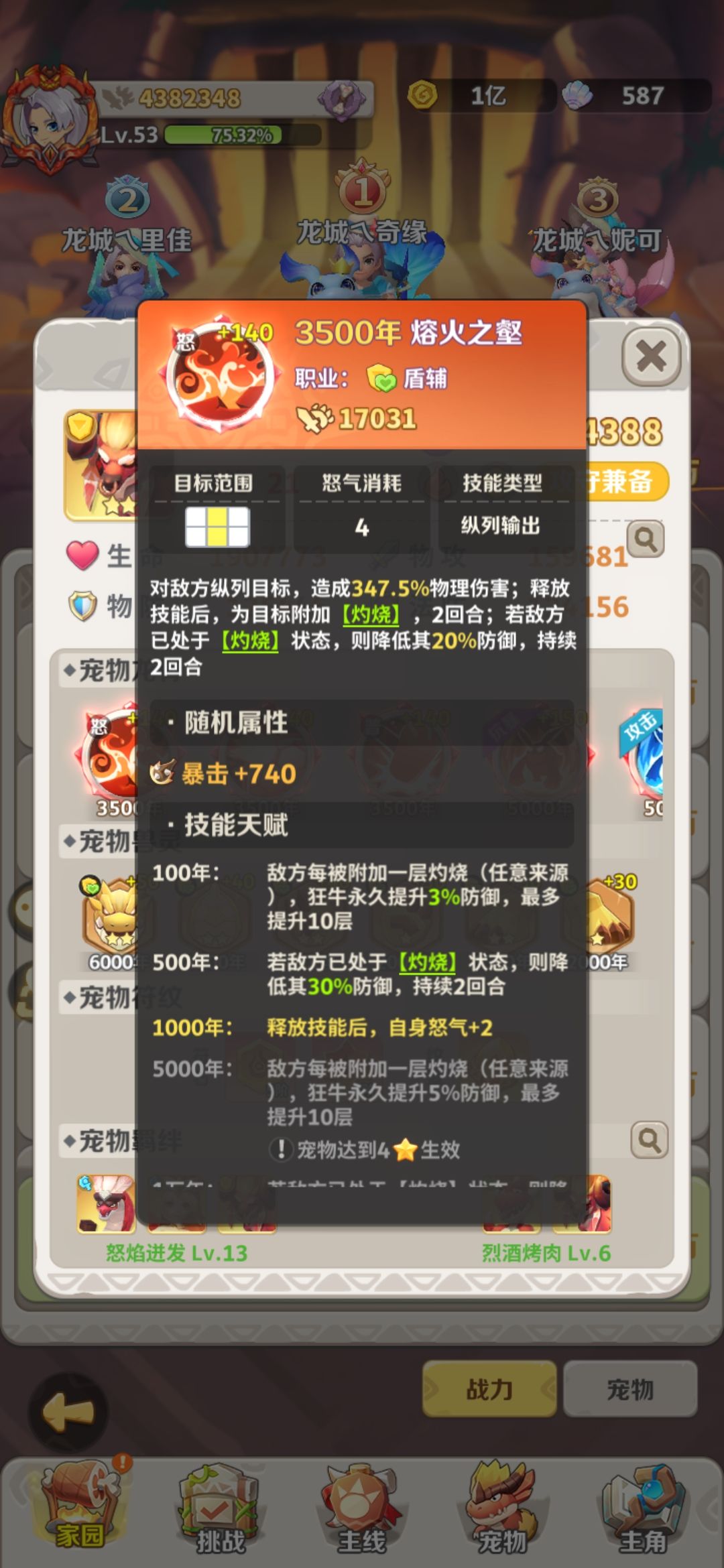 烈焰狂牛攻略搭配 区服:月夜风城 角色名:小宇 火系传说新宠烈焰狂牛强势上线 作为火系第一位传说品质的辅助系宠物给很多玩火系的玩家带来了福音也给了大家更多搭配阵容让自己队伍更强更有可玩性 今天一大早就起床迫不及待的抽出了我们的新宠烈焰狂牛自己也做了试验得出这英雄很有可玩性上限很高因为大家今天刚抽出可能星数不高可能看不出这英雄真正的强势之处 这英雄更适合刚开区的新玩家获取和一些玩到大后期的老玩家对于