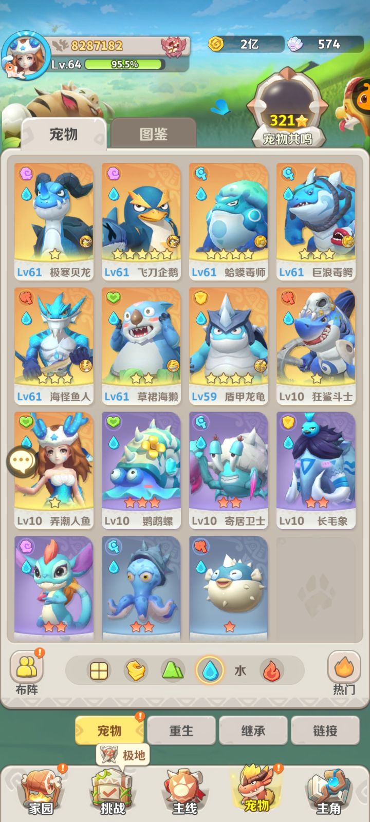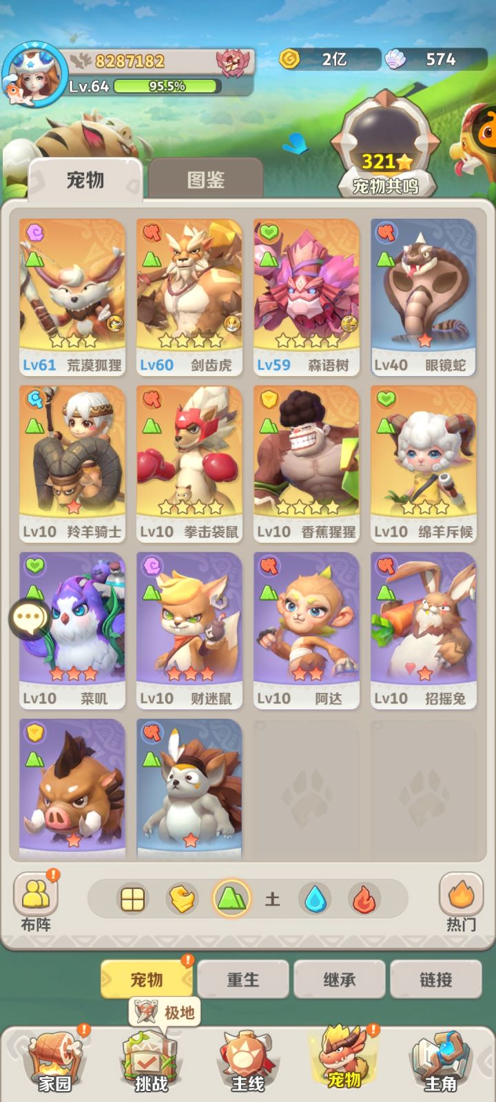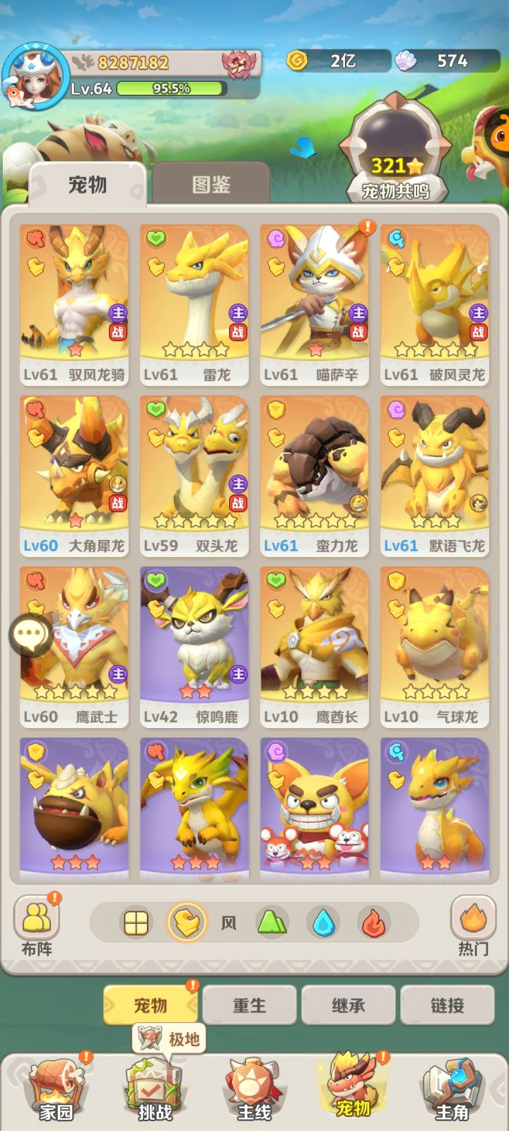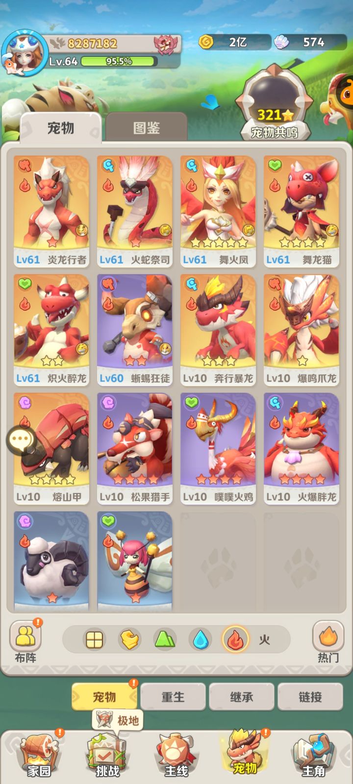 本人目前介绍:等级89,战力4400w,全区第1名(成功把大佬全熬走了)跨区十几名,个人阵容:贝龙,游龙,爪龙,sp火蛇,醉龙,老牛。个人也不算大佬,只是有一点微薄的理解,更希望大家在帖子下互相探讨。阵容选择:建议新手主玩火系、风系和土系,目前零氪玩家我建议是只练双c,一物一法。火系是过度最流畅的,赠送的宠物强度也是在线的。土系如果能抽到剑齿虎(主c)建议可以优先玩土系。个人感觉剑齿虎的强度不弱