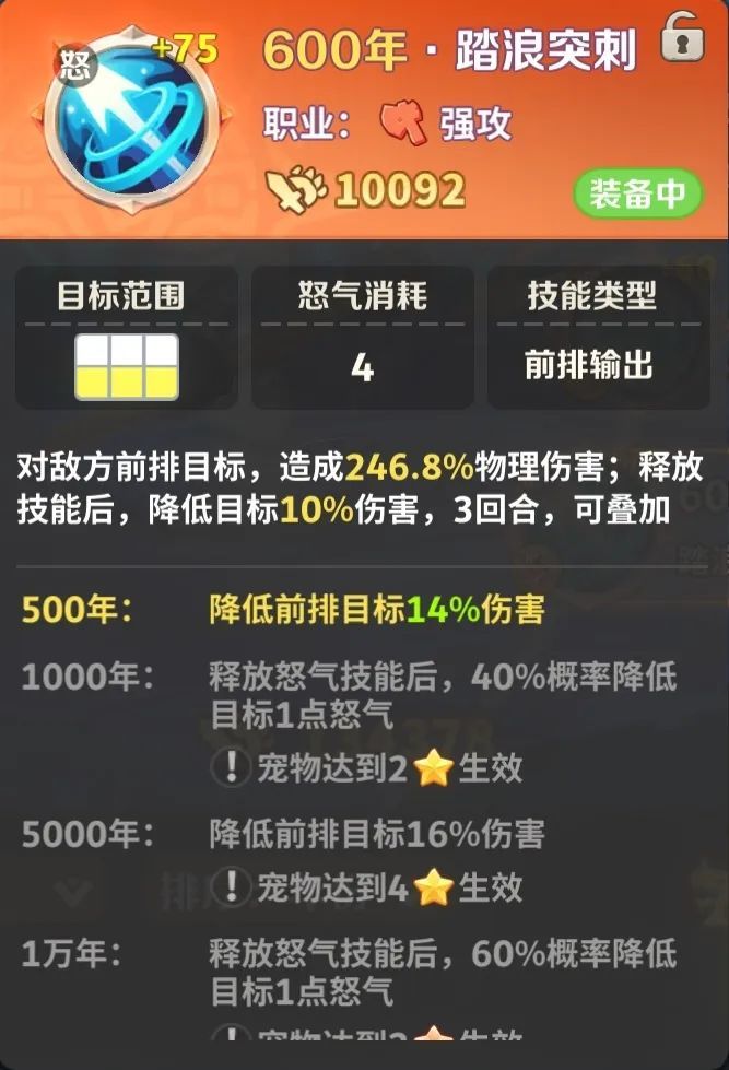 【踏浪突刺(怒气)】群体降伤技能,超高的攻击系数加成,配合被动“水流盾”的效果,造成超高伤害的同时做到了“攻守兼备”。【水流盾(被动)】让海怪鱼人的坦度大大增加,提高生存能力,并且追加护盾爆炸时候的群体伤害,同样也是“攻守兼备”。【鱼叉连刺(普攻)】增加了海怪鱼人的普攻伤害,普攻大幅提升了[中毒]的结算速度,提升了队伍的整体伤害。【激流之力(被动)】这个被动可以说决定了海怪鱼人在水系中的T0