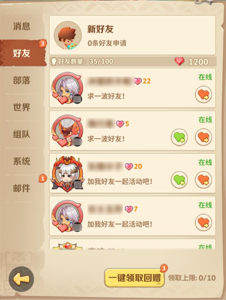 勇士们好呀~艾恩和菜叽向你问好!想象一下你只身一人穿越到未知大陆,那会是怎样的一幅光景呢?无依无靠的、孤独无助的?请放心!艾恩与菜叽会来接应你的!那么接下来为大家介绍温暖有爱的原始部落生活!出门在外靠朋友!这句话在伊甸大陆也同样适用,在一些活动中你可以与好友一起冒险!日常还能够互赠爱心获得友情点~友情点能用积分商店进行一些道具的兑换哦~有着友情的滋润,原始冒险一定是更加顺风顺水的!勇士们