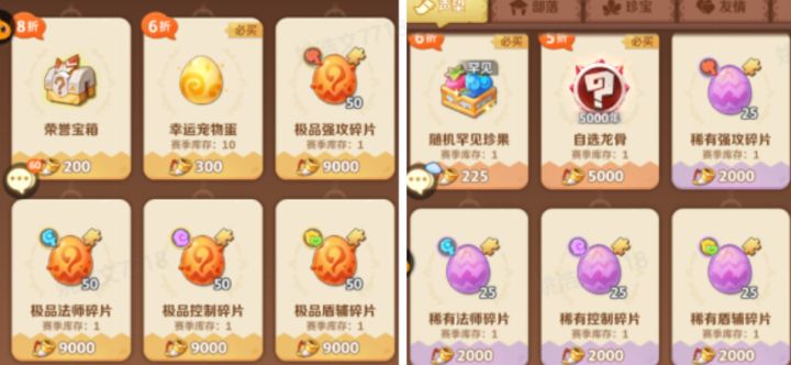 集市共分为五大板块:推荐集市、彩贝集市、神秘集市、积分集市、礼包集市一、推荐集市根据玩家目前游戏进度来推荐适合的道具购买购买推荐:荣耀月卡、至尊月卡、赛季战令、七日补贴、每日礼包等适合新手购买用来度过前期;后期按需购买道具即可二、彩贝集市消耗彩贝来兑换道具,优先购买折扣商品 兑换推荐:优先购买库存少的物品,例如兽灵石、龙骨晶石、锻造石、雕刻工具、珍果套餐等道具,每周必买;如果不缺上述