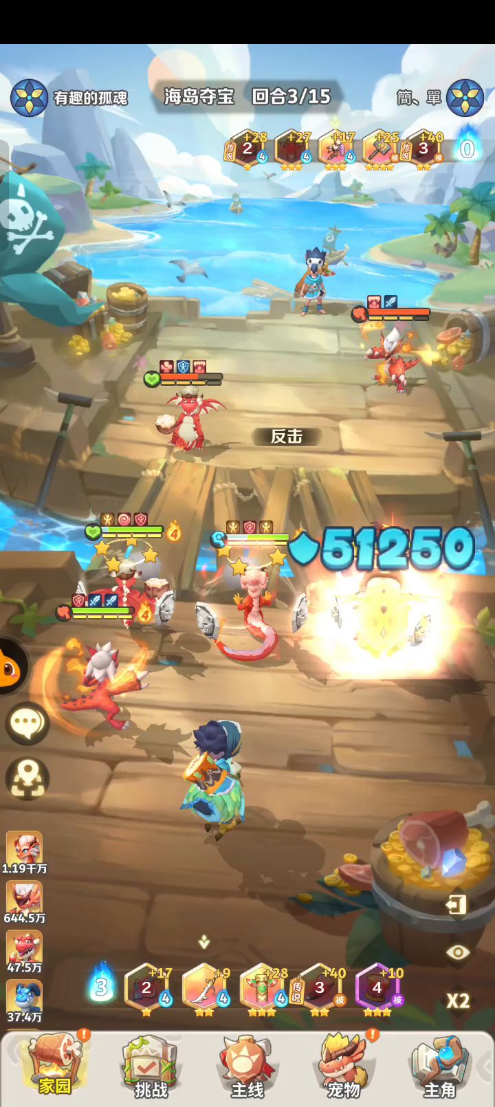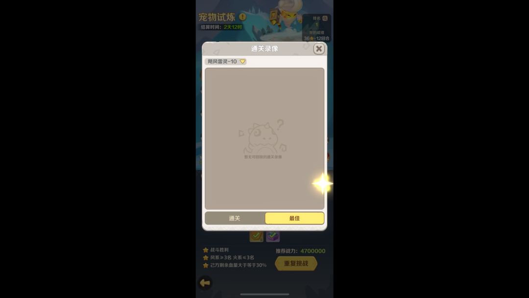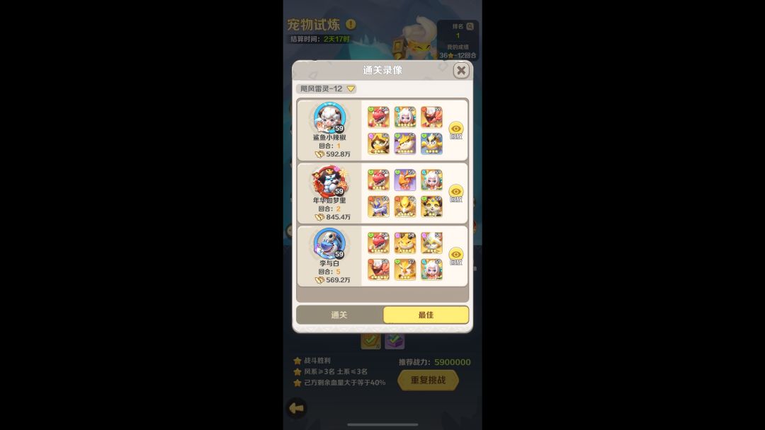 雷灵历练第12回合(堆伤害)视频参考 推荐战力:5,900,000 三星条件★★★ ★战斗胜利 ★风系≥3名,土系≤3名 ★已方剩余血量≥40% 醉龙/舞火凤/爪龙 喵萨辛/惊鸣鹿或双头龙/咕咕鹰 ※舞火凤是主C,但最重要的是要给主C堆叠伤害,所以我上了咕咕鹰,它的强化技能给攻击最高伤害+35%,效果仅有一回合,但也非常够了。
