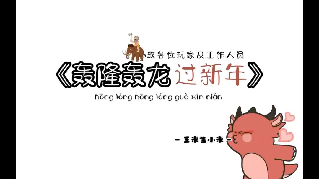 轰隆轰隆一声响, 炮竹烟花满天杨。 原始众人喜洋洋, 轰龙祝您龙吉祥。 祝各位原始人的玩家及工作人员们。 - 王米生小米 -