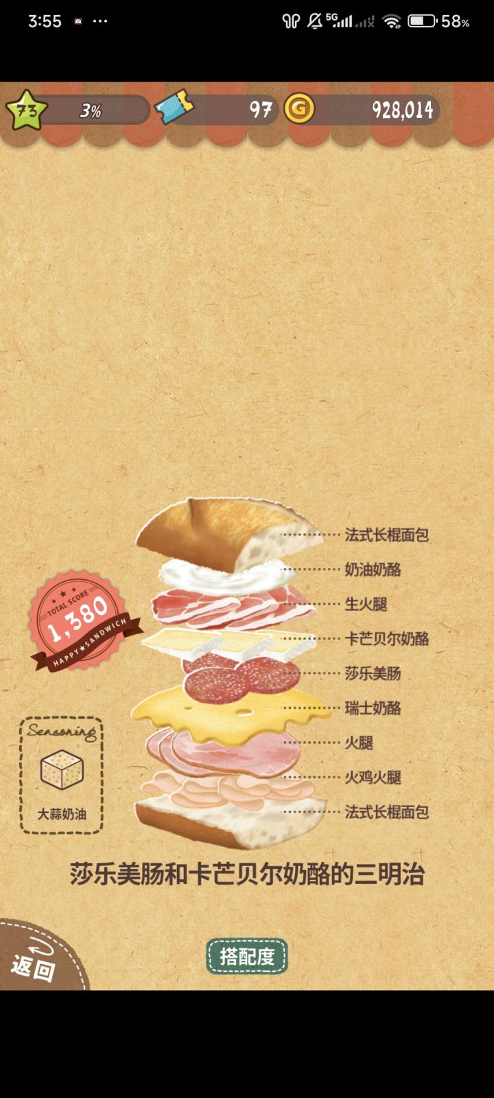 一个三明治解决4种肉类和3种奶油以上的要求俺仔细比对好久哈哈哈第一个32要求1009升满级就可以了34论坛没写明要求 俺参考上下随便堆了酱料到1300实际进去打1100左右应该就可以了