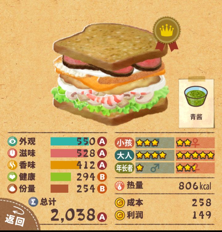 整理桌面不小心点开了,顺手完成装潢进度,要问【XX任务怎么做】,答案就是【不记得了】,社区有个帖子已经很详细了,自己去看看。我的【最高评分】。原始评分618。加什么酱能得到更高的评分是可以算的。原始分数尽量保持突出项>2,调味料百分比提升才更有效果。我不喜欢做三明治,懒得尝试更高分。为了方便,先放【调味料】。【小狗什么时候才会带回帕玛森】。我帕玛森刷的好感等级分别是78、88、96。