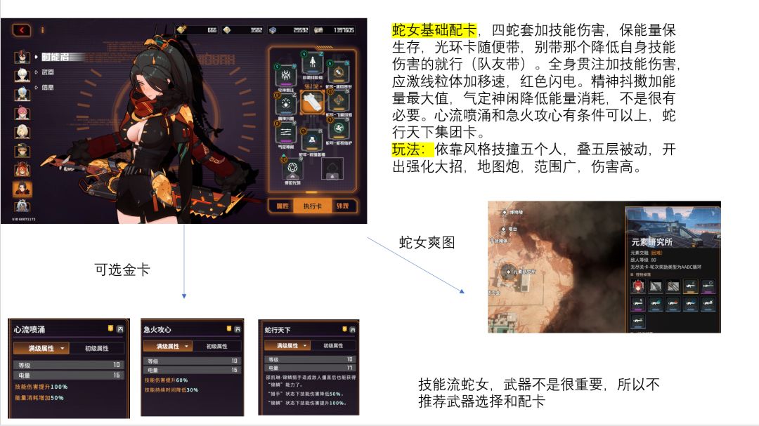其实没啥好做攻略的了,最近没啥大变动。 图1圆圈的位置是光环槽,是增加你角色能量的,增加的,增加的,最重要的事说三遍。战令里可以换。#驱入虚空 新手6块钱基本就能买一套蛇女加毕业mod,也就是执行卡了。 武器上堆暴击爆伤,这些角色的技能吃得到。 没有条件的话没必要上紫卡。 小男孩因为元素改版,削甲不能到百分百了,目前推荐带努啊达,有紫卡最好,开技能转圈几w一跳。 新活动地图个人推荐做一把蛇炮,飞