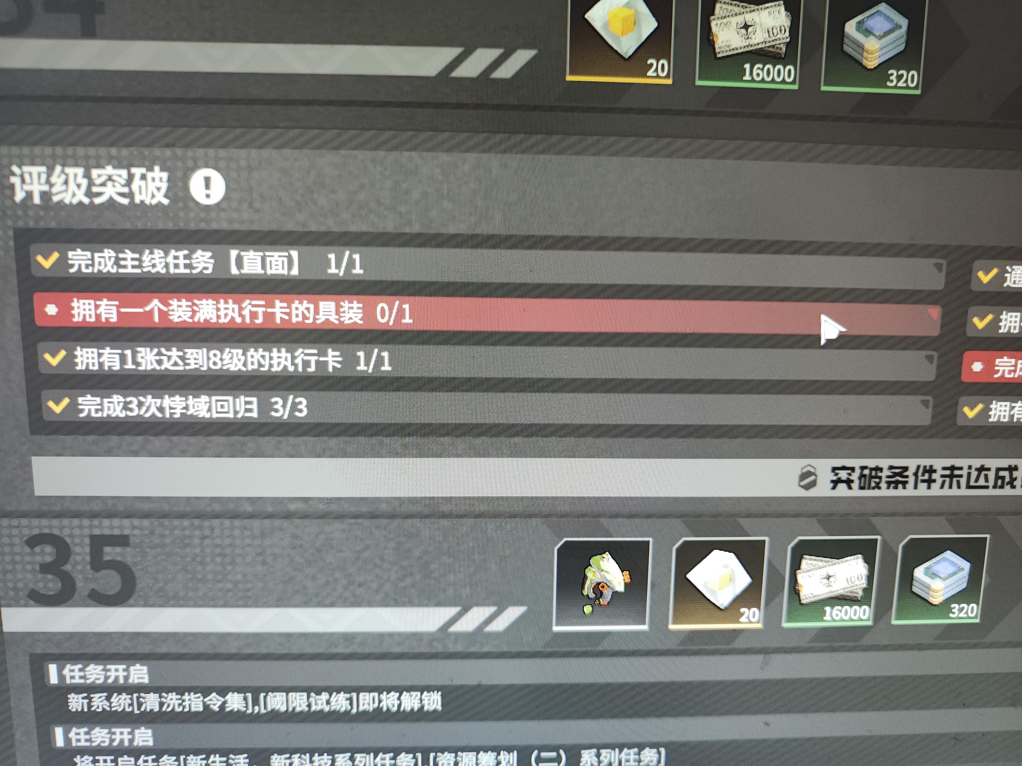 35级的突破条件,拥有一个装满执行卡的具装,我两个主战角色都30级执行卡都装满了,这个条件还是没答成,我这号是不是卡BUG了?