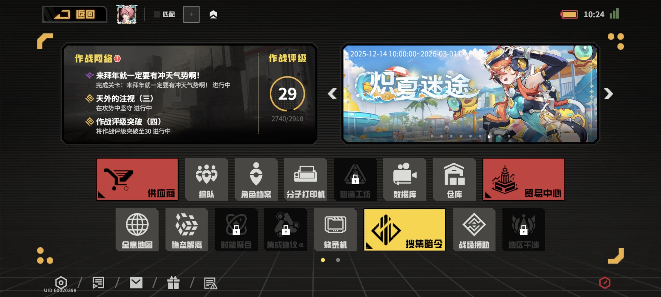 拉帕斯卡山原中的异宠、沙漠深处的神秘乐园、焕然一新的基地与生产设施、时能者和武器潜能深度激发……驱入虚空2.0版本「新程共赴」正式开启!核心更新内容新增具装:离火-牵绊、朱莉·摩恩-私法 光翼装甲新增时装:桃宫诺诺-海蓝航线、爱尔·斯宾塞-盛夏明姝、邵凯琳-常夏游龙新增武器:私法 芙蕾雅之矛、私法 狩猎长弓、野趣、囚影复合弓新增活动:炽夏迷途返场活动:异者归春新增剧情:炽夏迷途剧情、