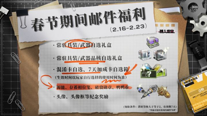 各位玩家:马蹄声疾,虚空迎春。感谢大家又一年的并肩作战,汪财特地给大家整理了春节期间(2.16-02.23)福利邮件汇总,请查收~需要注意的是:自选生效时间:表格中标注“生效时间以您自行选择的使用时间为准”的道具,可在仓库界面随时选择使用时间,请根据你的安排灵活使用。逾期提醒:邮件设有有效期及领取条件,请留意具体截止日期,避免错过。丙午新岁,愿你策马扬鞭,如风驰骋。再次感谢大家的陪伴和