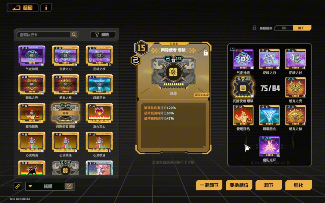 机枪哥就尽可能堆强度,大狙被动不吃强度,所以配卡如视频所示, 至于为什么不用破阵2上攻速吃加成,那是因为武器伤害区太多了,逆转加光环120,登场200,狙妹风格技本来以为是独立110,结果给技能是强度110,给武器就是武器伤害110,SB描述,这样武器区就有1+1.2+2+1.1=5.3,60攻速转的150就不如其他配卡了 集齐以上之后,再加上SB的bug,就能打出比计算高3倍的伤害,粗略研究