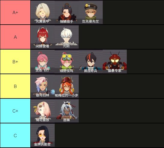 注释首先,将列出A、B、C三个级别。大级别的划分,主要考虑在日常刷图中有稳定的就业位置(功能性),同时考虑强度、数值的高低。有+号一列为更侧重就业,更推荐培养的角色无+号一列为更侧重强度,参考个人喜好培养的角色全角色简评:后面我会更新各个角色的详细攻略~包括配卡、思路等,因此此部分仅简评。A+:1.光翼——目前版本稳定就业:叠楼速刷核桃、厂区速刷钱、活动图、烽燧纪念碑。跟上版本