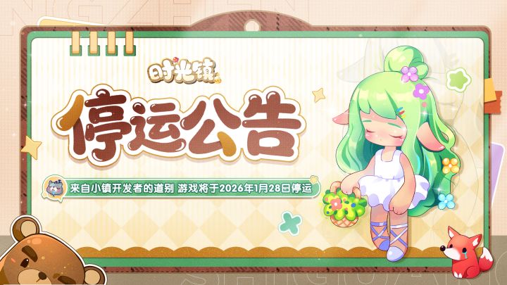 亲爱的小镇居民们:您好!朵朵衷心感谢每位居民长此以往对《时光镇》的认可与包容。由小镇开放入住以来,我们聆听大家的真诚心声与宝贵建议,有幸收获数无胜数的关注与偏爱,小镇施工队在此谨致谢忱。由于业务与运营策略调整等多方面因素,朵朵怀着万般不舍,非常遗憾地告知大家:《时光镇》手游将于2026年1月28日14时正式终止游戏运营,届时所有游戏服务器将被关闭,服务器关闭后玩家将无法登录游戏。对于本次停运决