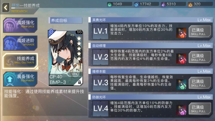 车辆生存核心,自身生存技能还行,群奶群攻群防45c,技能加命中,开局出兼职防空顺便速出兵,群防加点生存,可以和下面的可以一起练大后期输出,能力直接和点数上限挂钩,三技能输出很高,四技能看资源够不够了,但10图前都不必要防空对地都行,一次打四个,减对面回避(对空好用),射程远,70c不贵同上,但不减回避隐蔽,打单个敲点快,四技能后期好用,三技能看情况加强了群攻能力,还没练,估计好用被卖担