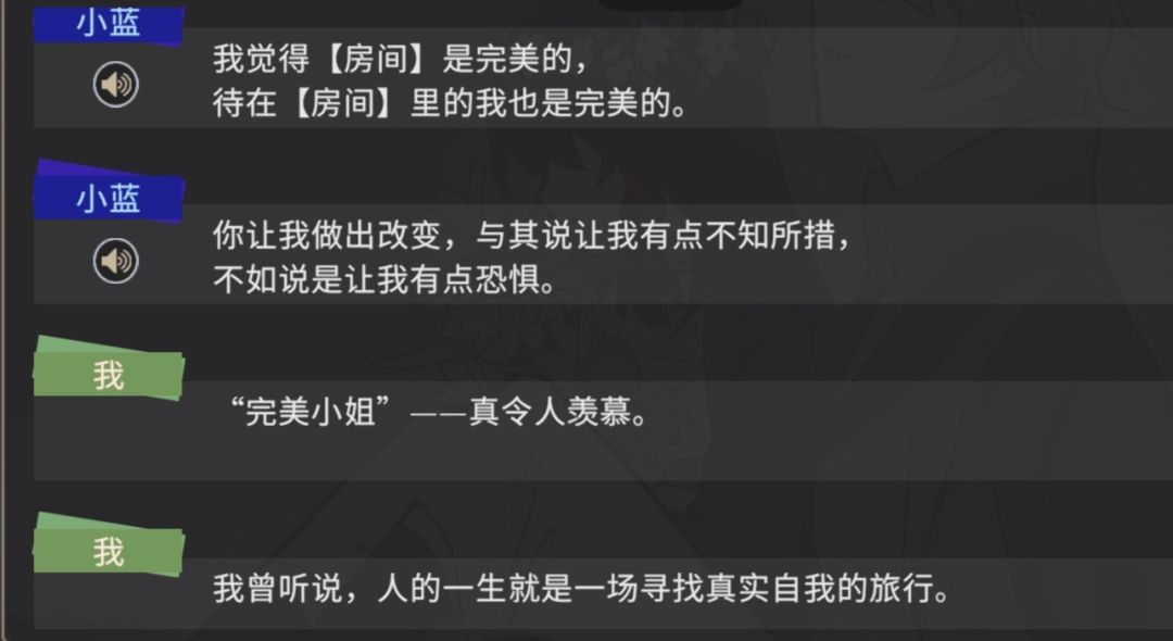 ~下面的是我对小美与小黄 小蓝之间的故事细节猜测~ 【避坑,以下观点全是猜测有什么不对可以在评论区说出来】 首先从小黄小蓝开始,在完成‘最初的海龟汤’之后会进入一段回忆(大概?) 其中小蓝与‘我’的交谈引起了我的注意 下面是原话: ... 小蓝:我觉得【房间】是完美的。待在【房间】里的我也是完美的。 小蓝:你让我做出改变,与其说有点让我不知所措,不如说是让我有点恐惧。 ‘我’:“完美小姐”——真令