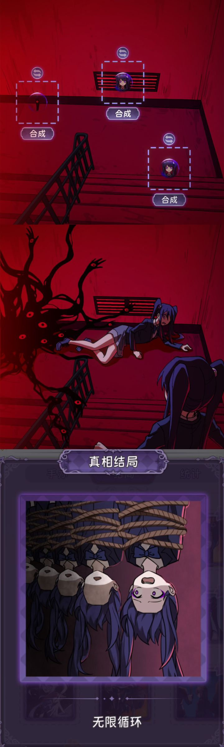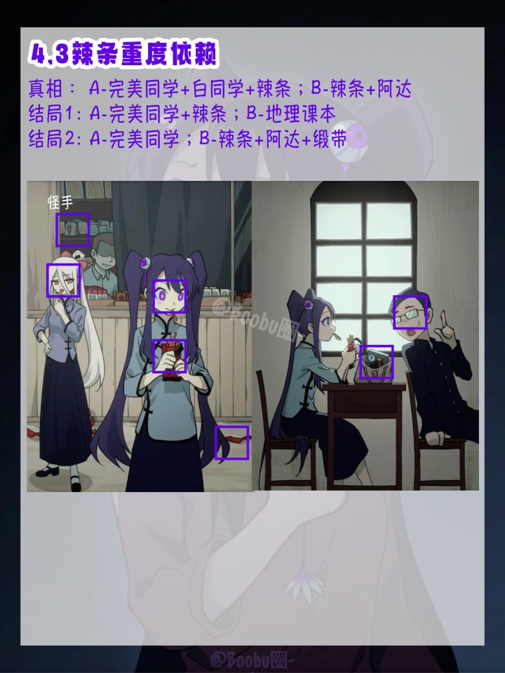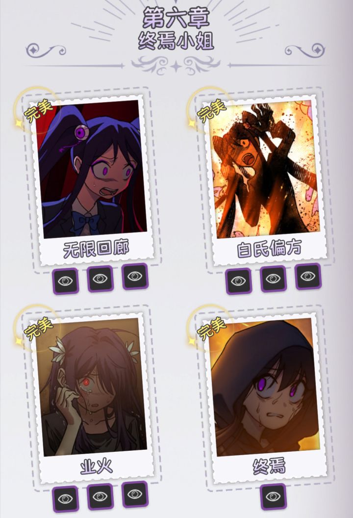第六章终焉小姐的过关攻略来了。由于第六章最后两关为完美小姐和终焉小姐的故事,所以最后一关只有一个真相结局。 第一关:无限回廊结局一:完美小姐发现她再也无法走出这个楼梯间了……结局二:“卡!完美小姐你怎么又NG啦!”白导演非常生气呀~结局三:如果这是一部逃脱校园的游戏,那么完美小姐遇到了BUG…… 第二关:白氏秘籍结局一:白小姐研发的奇怪药水治好了烧伤的完美小姐……(完美小姐强迫自