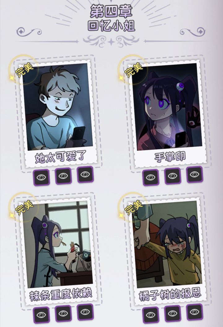 第四章回忆小姐攻略来啦~第一关:她太可爱了结局一:手机另一头的白小姐居然是抠脚大汉…结局二:求助,网恋到了亲妈怎么办…?结局三:完美小姐今天伤透了心… 第二关:手掌印结局一:这个手掌印…好像是从里面印上的…结局二:掌印竟然是前往异世界入口的开关,不过很可惜的是,完美小姐她卡住了…结局三:完美小姐本来想和掌印内的怪异触手友好互动,没想到触手却并不好相处呢… 第三关:辣条重度依赖