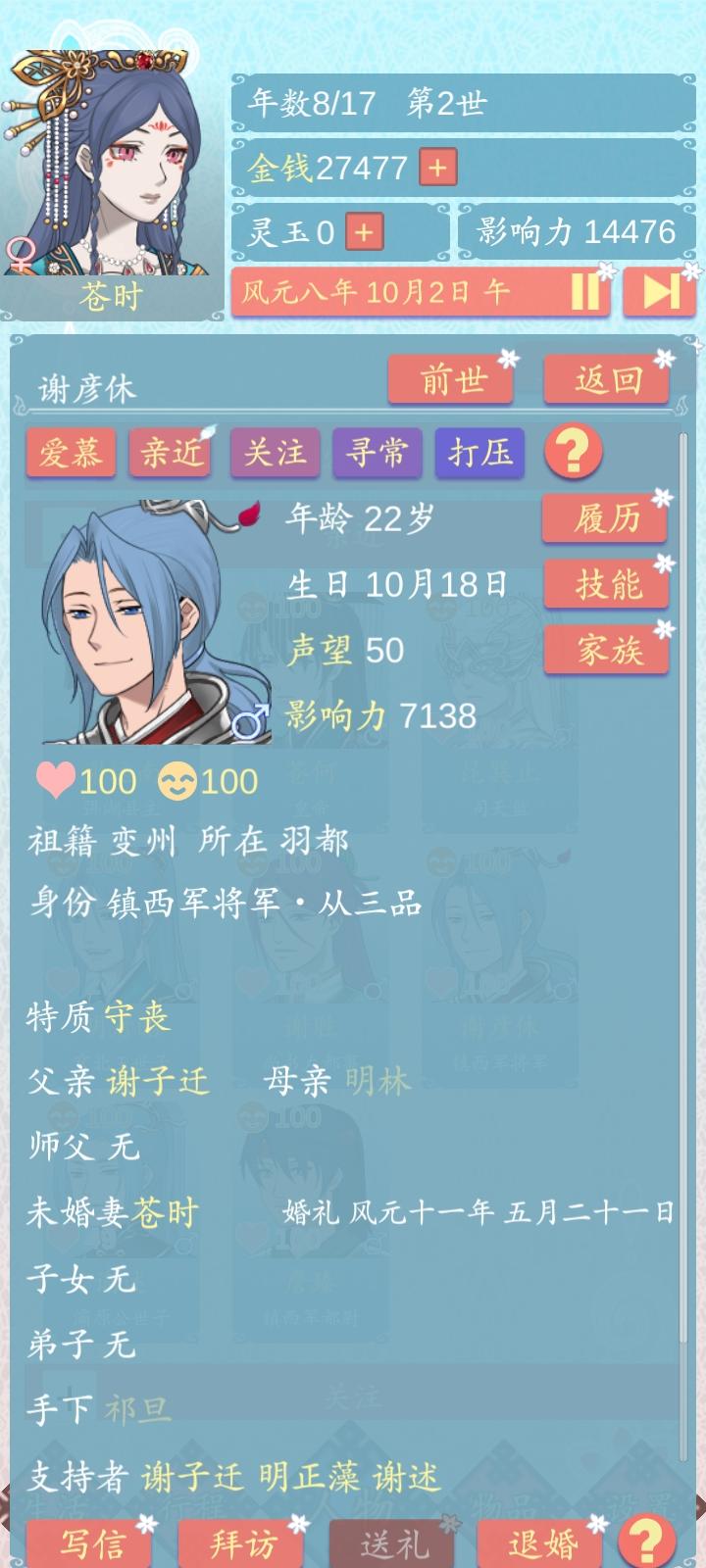 才玩第一世等了好久,终于下一年就是婚期了,结果他跟着他爸去打仗,打输叛国了😳。。沉默