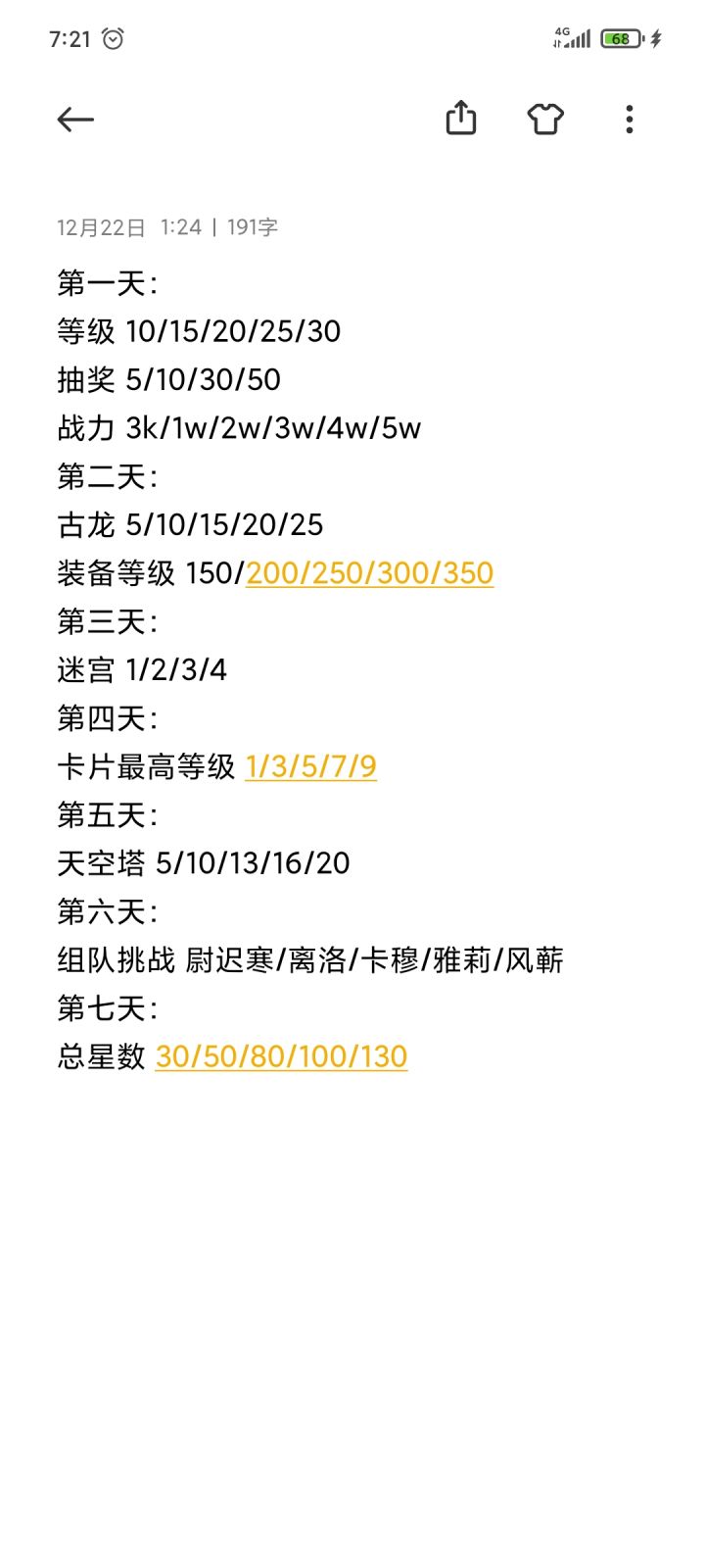 新手不用着急领不到第七天的焚天前期只需要把第7章打通就可以领大半的奖励了抽奖的话把序章到第三章的困难关卡打通应该就有50张左右了(记得领礼包码)。抽奖方面个人强烈推荐特殊召唤(便宜还有保底),特殊召唤抽奖次数算新手7日的。7天的任务我整理好了,不用提心吊胆的想着完不成任务了|・ω・`)