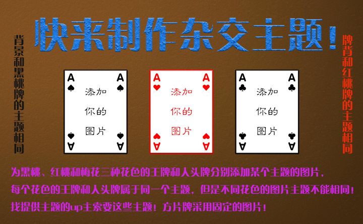 我只做过一套主题!我负责转载和修图!在这里获取更多主题:只能给黑桃、红桃和梅花这三种花色的王牌和人头牌分别添加某个主题的图片,每个花色的王牌和人头牌属于同一个主题,但是不同花色的图片主题不能相同!背景和黑桃牌的主题相同,牌背和红桃牌的主题相同!方片牌采用固定的图片,方片J和A需要放大一下,且方片J和K放大后还需要调整位置,链接如下:添加效果如下(方片牌的图片固定,其他花色任意,但是同花色