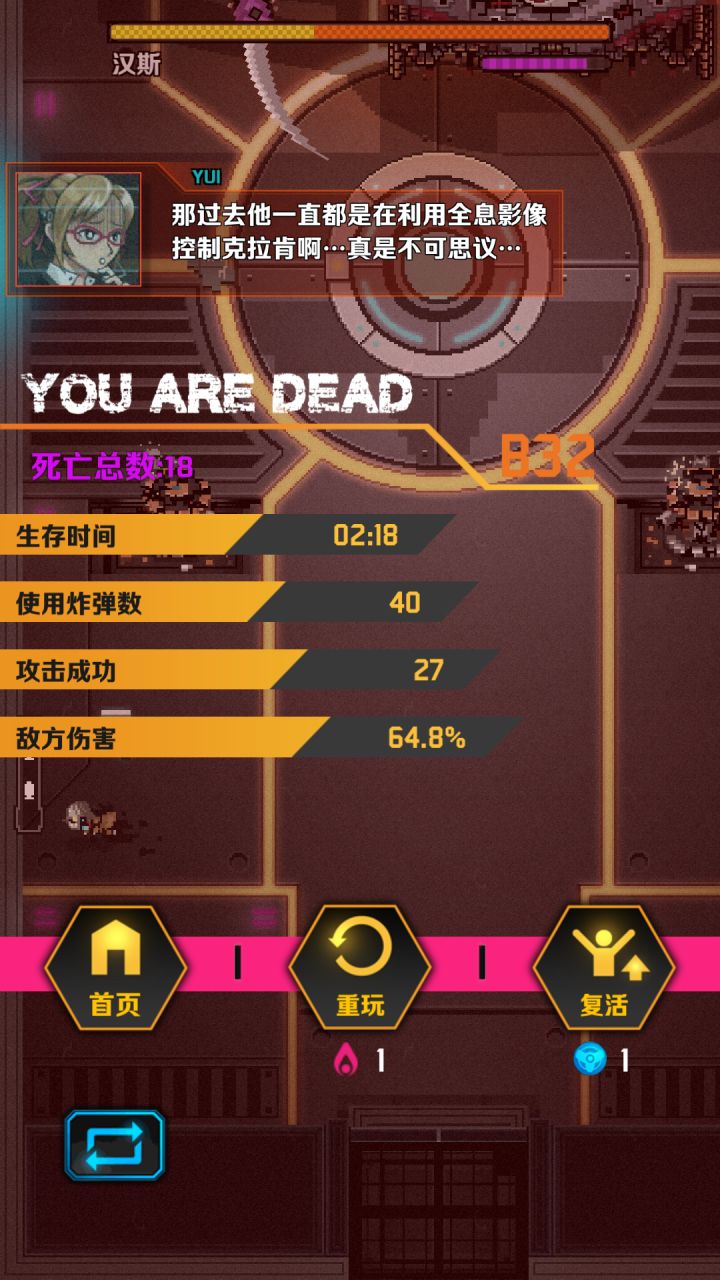 B32这boss………快无解了攻击1:放一个dna形状的弹幕 飞出一段时间后炸开 子弹随机散开攻击2:眼睛两边放一排弹幕扫全屏 除了他面前不会打到攻击3:左右两边出现一排弹幕扫过来攻击4:屏幕上方随机出现五排弹幕 随意散开攻击模式大概就是1→2→3→4→3循环半血暴走后1→2这个过程无缝衔接 不给安炸弹的机会 攻击3和4的弹幕速度变快强行把你逼退多出攻击6:发射一个x形弹幕攻击模式