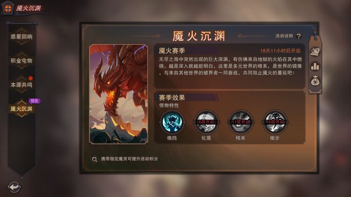 各位破界者:塞勒特大陆核心竞技玩法魇火深渊正式上线!玩法将以赛季的形式,每间隔1个月推出(新区首月不开启)。每个赛季的怪物特性都会重新设计,为了适配百花齐放的流派,我们会尽可能的把策略性提升。主城活动界面将提前半个月告知下个赛季的主题,第1赛季将在月底开启,大家可以针对的准备起来。玩法奖励分挑战奖励 + 商店奖励 + 排名奖励,奖励丰厚!#游戏讨论#攻略#单机游戏#游戏资讯#吃瓜爆料
