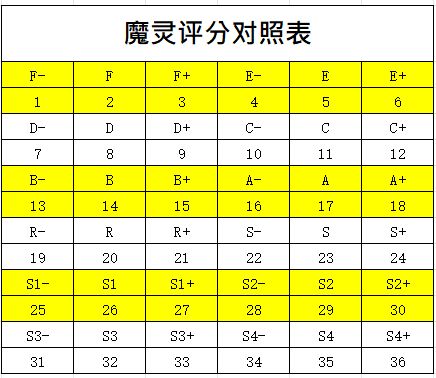 魔灵评级按 F- 为 1 条,F 为 2 条……S4 35 条,S4+为 36 ,每只魔灵都有 8 个属性,总的评分为 8 属性相加的和,快来秀出你们的魔灵吧。区服:1001数字账号:2873id:樂行者