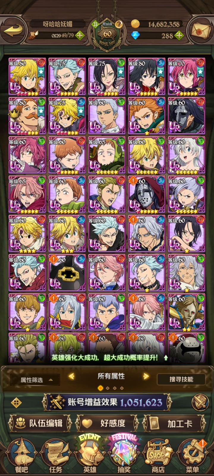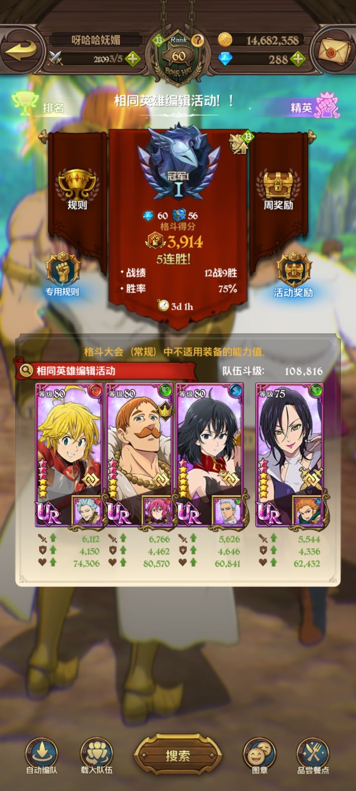 修炼窟还剩最后两个boss,战力不够把把后手,5个团长全用完了,就靠他这个劳模撑场面😂😂😂第七关灭了N次,金每次开局就跪剩个伊丽莎白和马琳,没想到最后单挑boss极限过关第八关海尔布拉姆就记得留了个红面具当对策卡,忘记留c了,连夜把班和面具哥的觉醒刷一刷,明日再战!竞技场随大流换成分身团阵容了,普通完成本周保底就没打了,争取这周把精英的保底也拿了,不然明天更新完一堆85级的更难打了