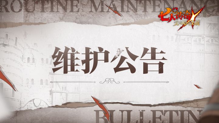 亲爱的各位玩家:《七人传奇:光与暗之交战》将于北京时间5月24日7:00~9:00进行预计2小时的更新维护,维护期间您将无法登录游戏,还请各位玩家合理安排游戏时间,及时做好下线准备,以免造成不必要的损失,非常感谢您的支持与配合。维护时间:5月24日7:00~9:00维护补偿:钻石*2领取时间:5月24日9:00~5月26日23:59*维护补偿将于本次维护结束后,在领取有效期内发放到您的邮