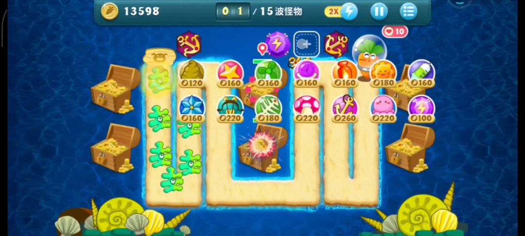 @执笔续今生 深海第10关玩法简析开局先用章鱼控场+清道具。建议位置如图(延长同一波内清道具时间),第二波就可以把箱子解决。然后再放一只章鱼合力清道具,接着种蘑菇+升级太阳。多重箭和汽油瓶没太大用,可以直接拆掉。然后升级魔法球,提供高效补刀。期间继续种蘑菇。种蘑菇刷钱不能停。钱够多了,接下来开始转鱼刺群阵型。输出相对来说不重要了,可以把除蘑菇和鱼刺外的炮塔都换掉。鱼刺群布置完成。由于嫌进度太慢,最终阵型中把所有炮塔替换成了鱼刺。