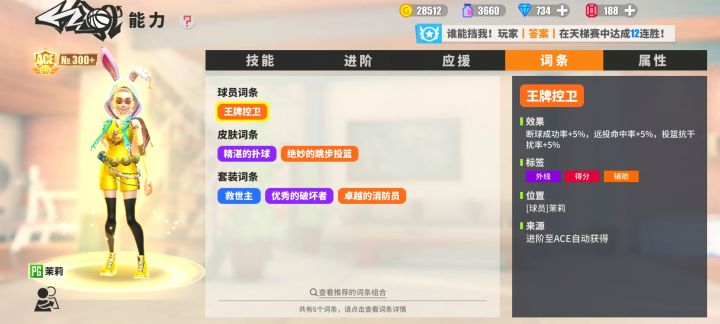 游戏Id:37148 游戏角色:朴素的科沃尔本人是传统的地板位 茉莉有几点 浅聊一下 茉莉皮肤词条可以洗出挑断技能 建议玩家可以加强橙色挑断(之前洗掉有点后悔)挑断技能一出 就可以完全不惧怕扣篮队 当二大一小扣篮阵容出现时 完全和本队得分位 换防 到内线疯狂挑断球 掏球成功率还是很高的 扣篮阵容在内线拿球 由于对方内线 移动速度不快 还是会相当有所顾忌 (之前5级挑断的时候有一场 内线保安就被掏