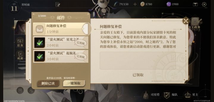 我不是一个喜欢看剧情的人,所以一般跳过(小声:剧情有点幼稚)画风我很喜欢,钟表和星座的元素真的真的太戳我了(不如说这个游戏整体美术是除了阴阳师之外能迷倒我的)肝度刚刚好,因为是测试所以送的资源很多,副本可以直接扫荡省时间,很适合佛系玩家,但是不知道正式上线了福利会怎么样,如果很少送体力那个花,养起来还是很慢的。至愿之境不错,相当于家园,很适合养老玩家(喝茶)抽卡情况:测试送的限时池子到现在