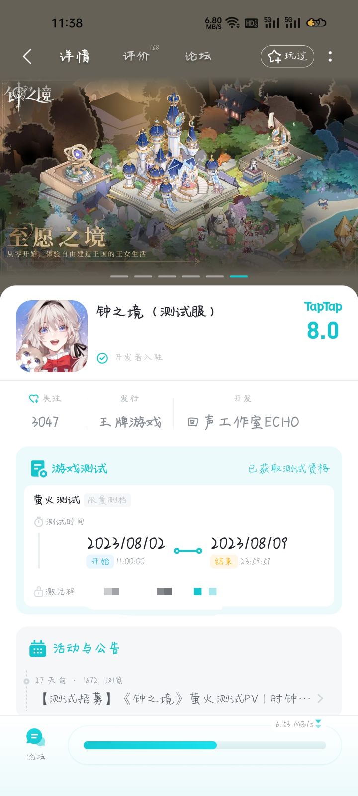 亲爱的王女殿下:「萤火测试」预下载开启啦!💡预下载方式💡预下载时间:2023年8月2日11:00前往TapTap“钟之境(测试服)”进行预下载,戳→https://www.taptap.cn/app/279429*现仅开启预下载,测试正式开服时间为8月3日上午11点。💡测试玩家群💡为更好地与王女殿下沟通,请加入下方专属测试群!萤火测试期间,测试群内将每日发放专属福利。钟之境官方/T