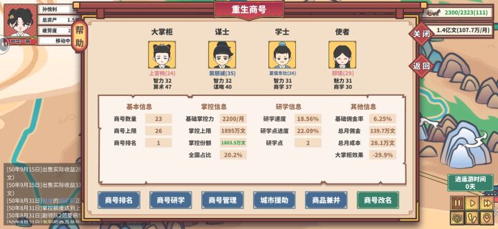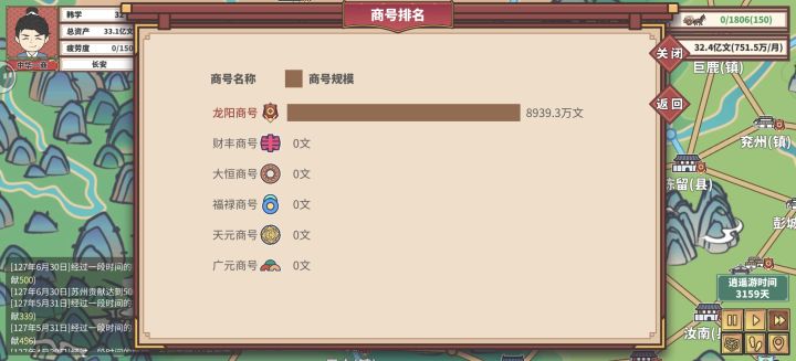 目前是3代人,流动资金1~2千万铜钱,每月净收益2W,不玩了。