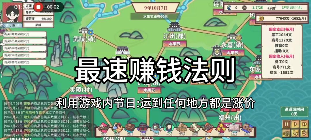 1.开始别管贡献,开了商会就选择城市援助增加贡献,中期皇帝要什么再去专门开那几个,大概就是洛阳广州之类。 2.优先升级车,买能驼最多东西的,及时升级称号可以多买车。 3.家族好玩呀虽然用处不大,攒点钱先搬到州或者皇帝家,然后找悟性高的老婆,生下来的二代34到37左右,三代45到49。加个15属性宝物用去谋划快速收割。 4.我后面主要在研究商号,设置掌柜会自动增加占比,我就用高谋略的谋士去造谣,成功