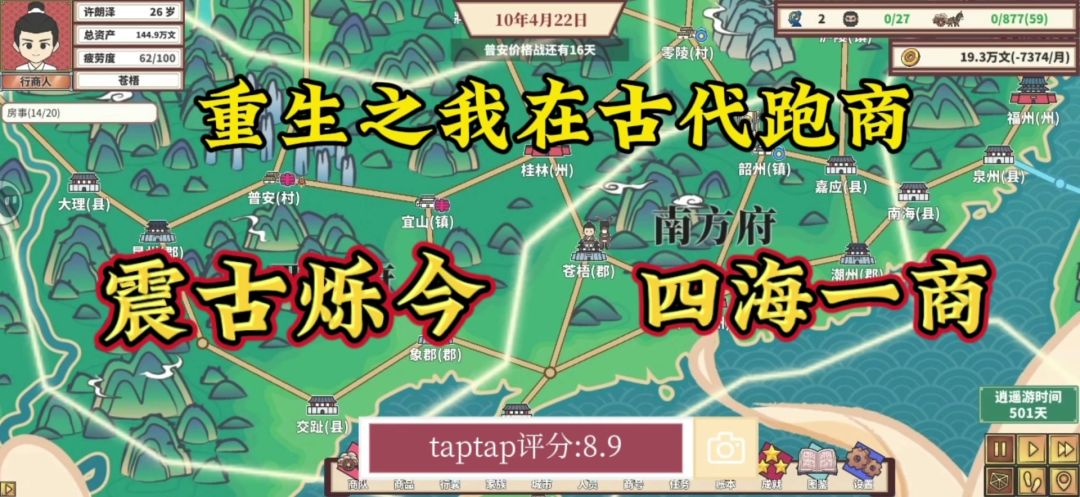 前面20个新手任务指引不提,在此基础上,略有感悟。 1.开局不应该乱跑,应该把握各种节日(打铁节、水果节)跑商积累资本。 2.不应该在村里买俩驴车呜呜呜……这破车是村里卖的只能升1级,镇里的能升3级,依次类推。 老实走完教程之后,先去镇上买俩牛车升3级。 3.第一个商号跟着教程放村里了,然后就憋州级商号,80万而已,镇郡县直接不要。 4.通过宝物界面分析,先拿下西南和南两处,在广州拿到西域通行证之
