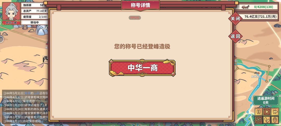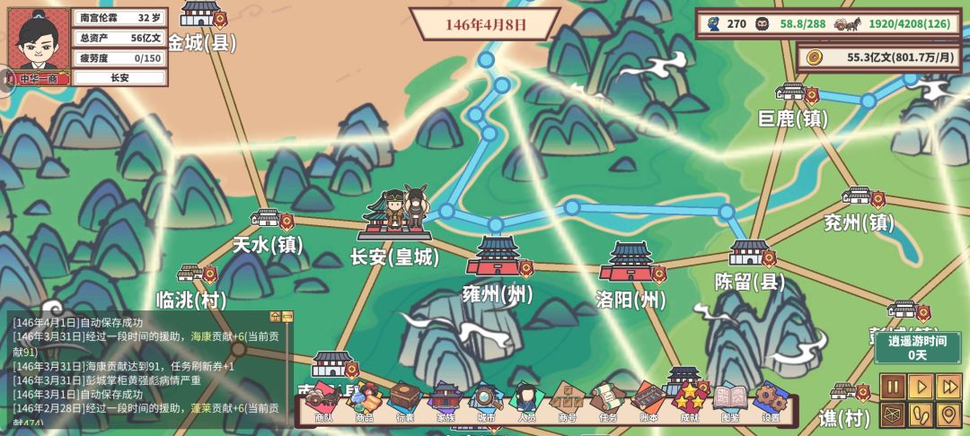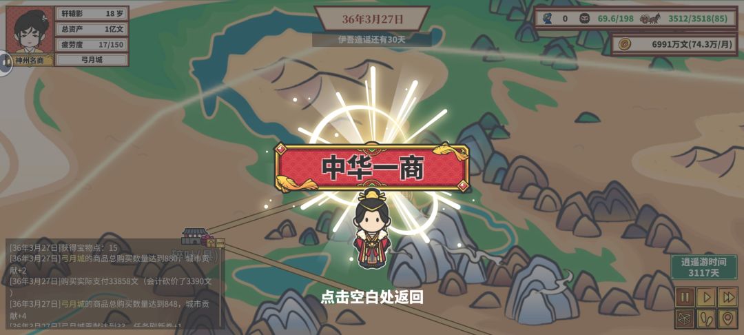 86年达成统一,理论上还可以在快点,快中华一商时,都是全推,都没去看任务,导致有些没跑商到的县、郡等,贡献没达到,后期时需要去招摇拉股,70多年才发现还有皇城任务。前期需要快速拿到发展的资金(100多万),牛车从1级车换3级升满,再换6级升满,换10级换15级升满,快10年左右基本就够了,然后去拿鞋子,跑几趟,州贡献就够了,前期先从州和郡开始开商会(后期抢股会容易先,发展起来后,中期就不缺资金了)