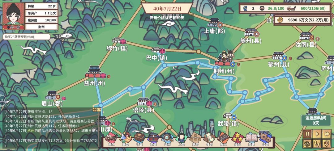 32年一代通关,也在皇城有了第二代可以干活的免费高属性接班人,参考了攻略里走广州,桂林,还有象郡的三角路线,平时涨价多了,快升职称了就去周围城市买买新鲜货,前期主要还是抓紧换高级别牛车,1+1/1+3+3/6+3+3/6+10+10/15+15+15。也不一定,前期趁着水果节,打铁节,低买高卖很容易赚到第一桶金60w(暂停游戏时,点查看城市可以看到哪个城市可以解锁打折物品,p.s.后面可以看任务,