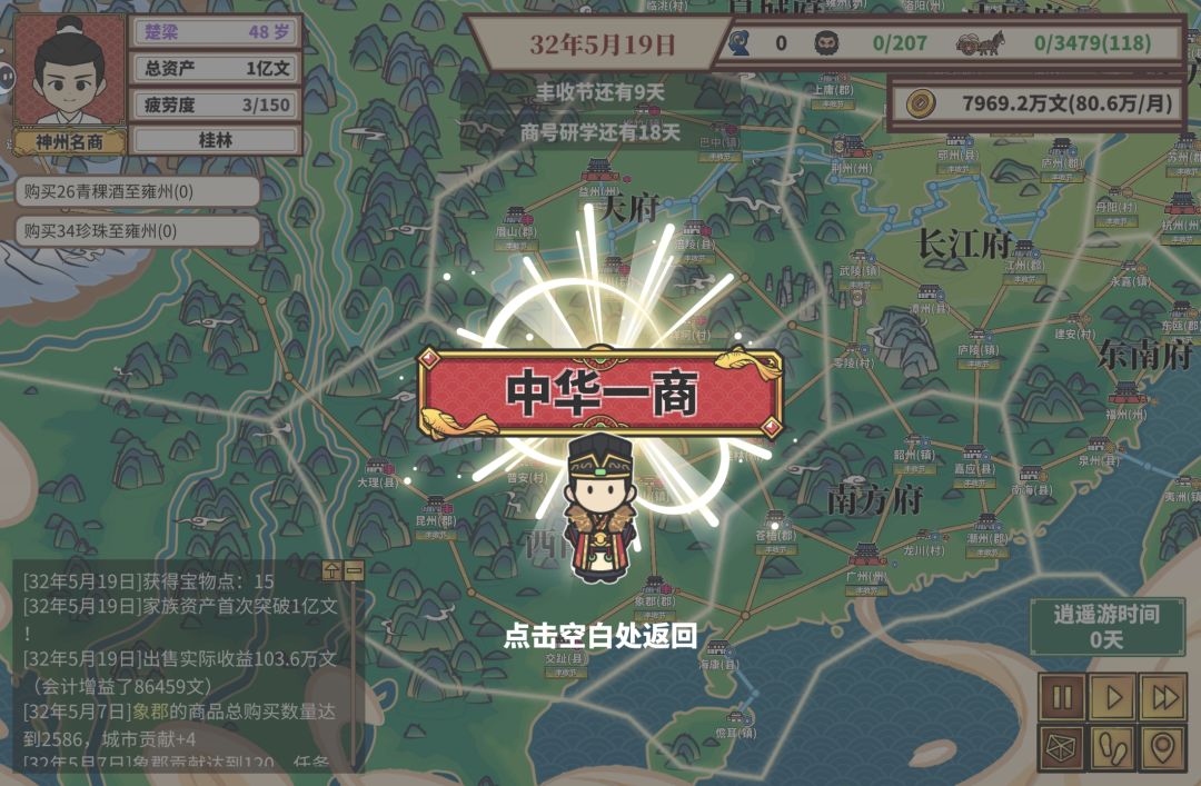 感觉前面二十多年都在摸索怎么赚钱。后来是为了拿道具,打开了分开以各个府为区域集中买卖,拿下贡献值以后,钱就上升很快。并且一定要打开地图模式❗(在倒买倒卖的时候。 最终拿下所有道具,达到中华一商。 ⭕记得只开:州-郡为商会,及时跟进商会策略。慢慢就上来了。 挺好玩的,需要动脑筋。前期想找到一条合适的路线很难。#四海一商
