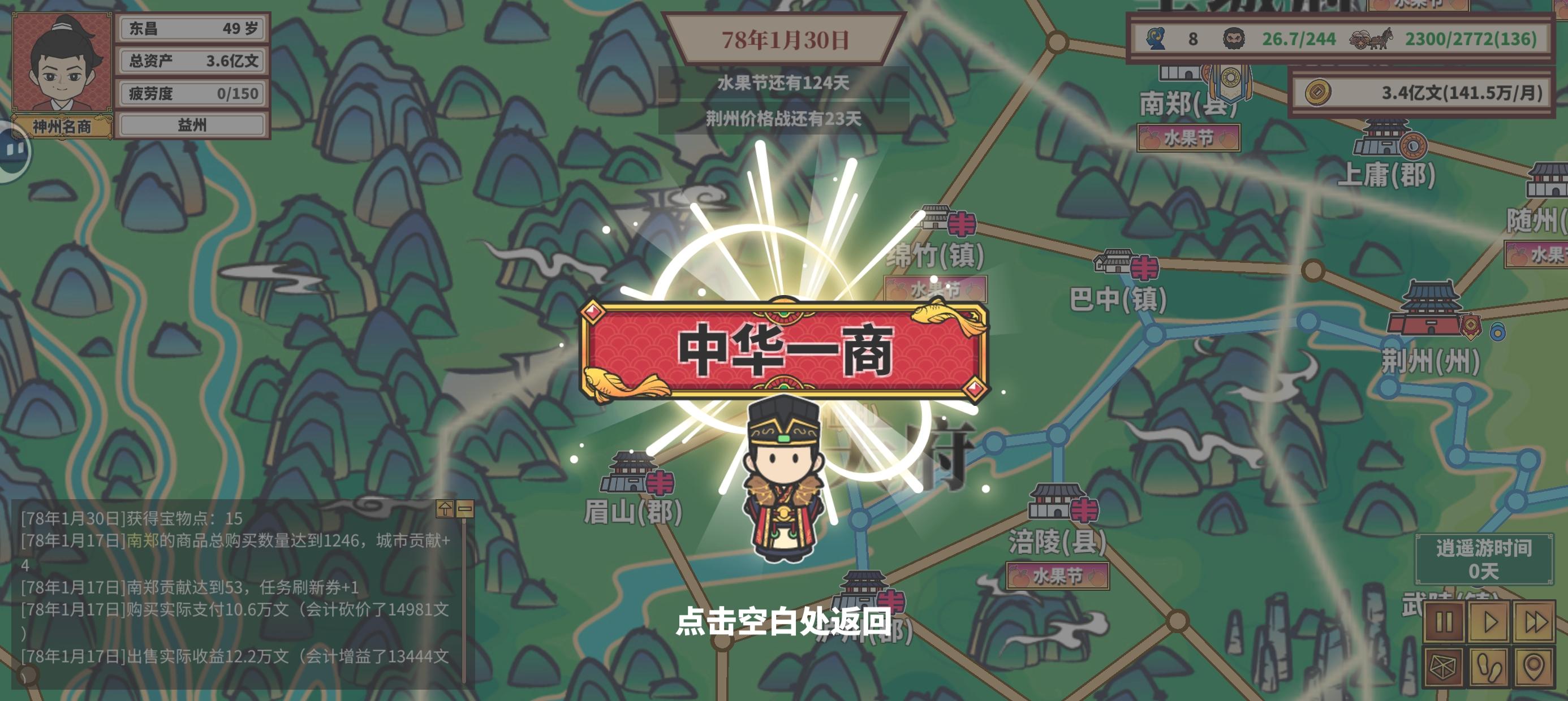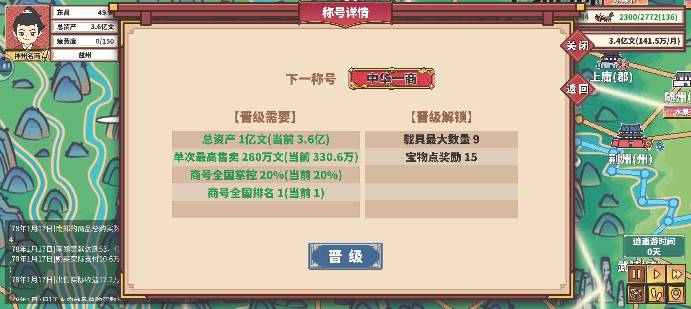 9年10月达成中华一商,关键在于1年底就要完成第一次进贡。图3是1年4月资产百万,图4是1年10月解锁丝绸可以进贡。这时候负重不够,跑了两趟成功在1年11月第一次进贡成功(图5)。图6是4年八月解锁神行靴,图7在5年1月拿到聚宝盆。大力发展自己的老婆,像图8一样高属性。最终兼并商品见9-12。