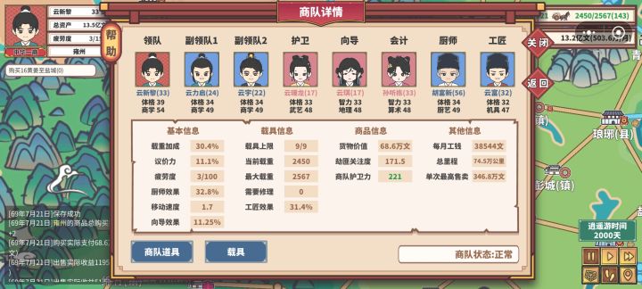 个人感觉挺费手的小技巧1.落地长安选马车,招四个人,两个体格12商学之和大于等于20,其他两个选价格低的,这是前期让载具容量最大化的人员配置,一级马车达到惊人的84容量,开局可以接到7石头/木头的任务。一级马车加两个三级牛车可以完成绝大多数的村镇县任务,跑得快拉的多,挺装的2.第一个月招完四个人后,探索两次,第一次探索任务券,第二次探索两个土豆,第二十天跑到天水卖掉土豆接上任务跑回临洮,开局招